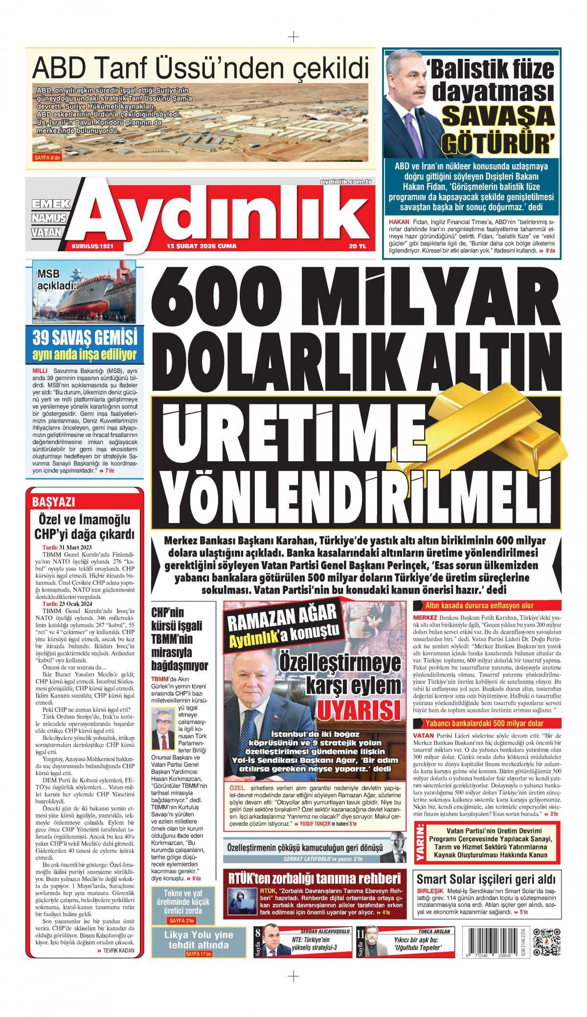 Aydınlık Gazetesi 14 Şubat 2026 Günü Gazete Manşetleri