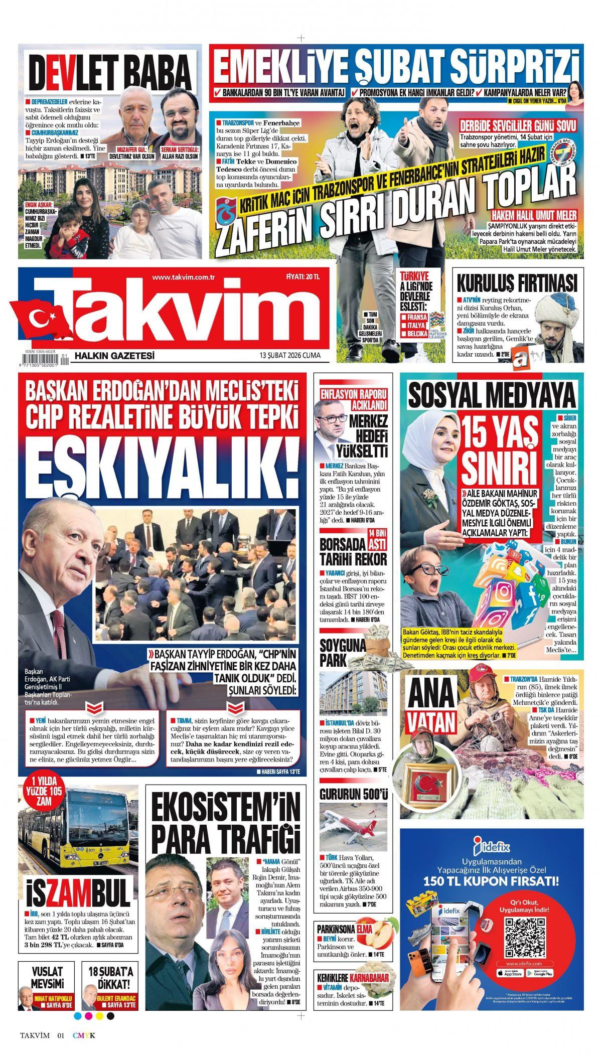 Takvim Gazetesi 14 Şubat 2026 Günü Gazete Manşetleri